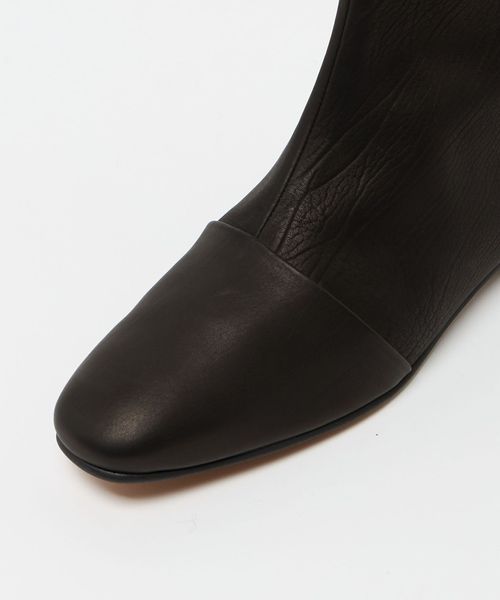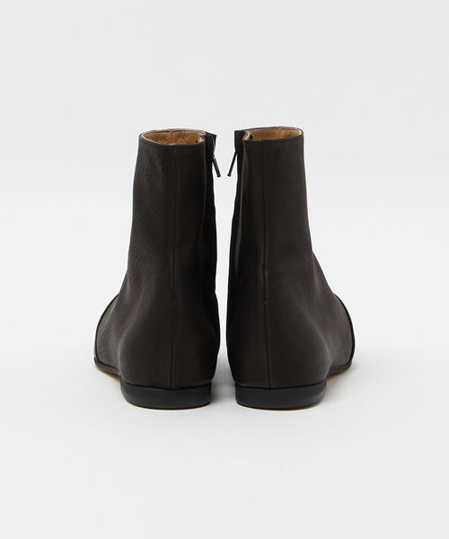 シボのあるレザーを使用したミニマルなデザインの、ショートブーツ。