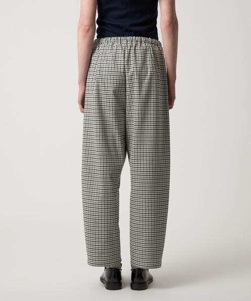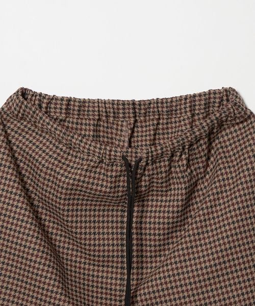 シックなカラー使いのチェックがきちんとした印象ながら、ウエストのドローストリングがカジュアルさをプラス。