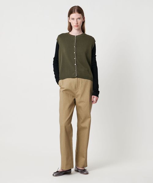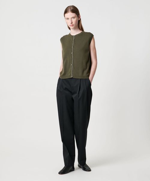 前開きのミニマルなノースリーブデザインで、コーディネートに新鮮さを出すアイテムとしておすすめです。