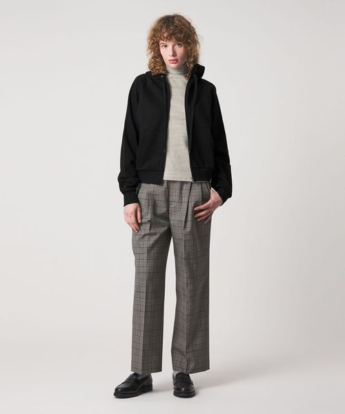 立体的な形のフードが上品さをプラスし、インナーにシャツを合わせてトラウザーを合わせるきれい目なコーディネートも可能。