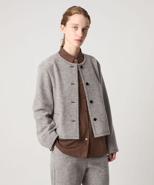 毛足が控えめな品のあるボア素材を使用した、ノーカラージャケット。
