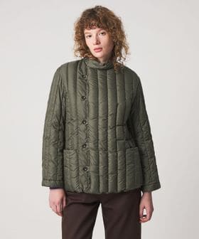アシンメトリーなフロントデザインにスタンドカラーが特徴のダウンジャケット。