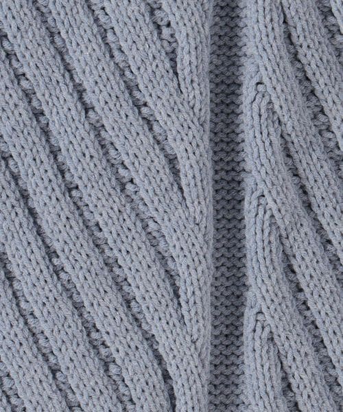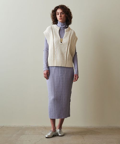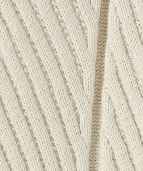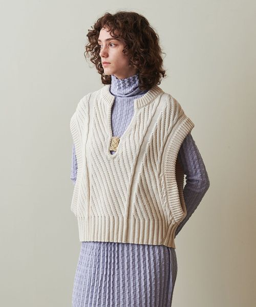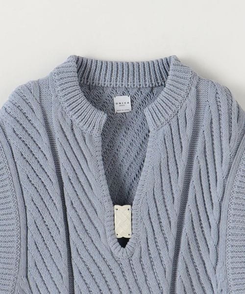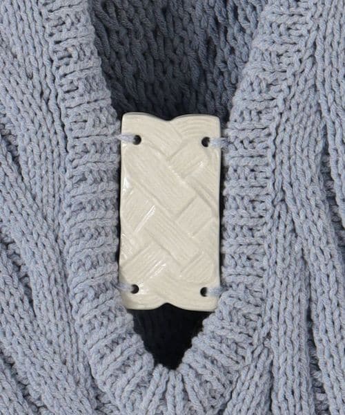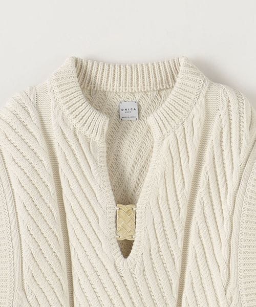 深めに開いたキーネックに配された陶ボタンに、変化のある編地がどこかレトロな雰囲気。
