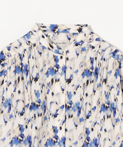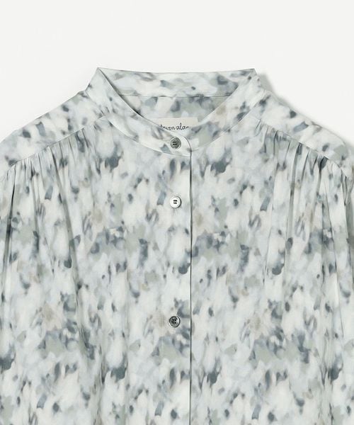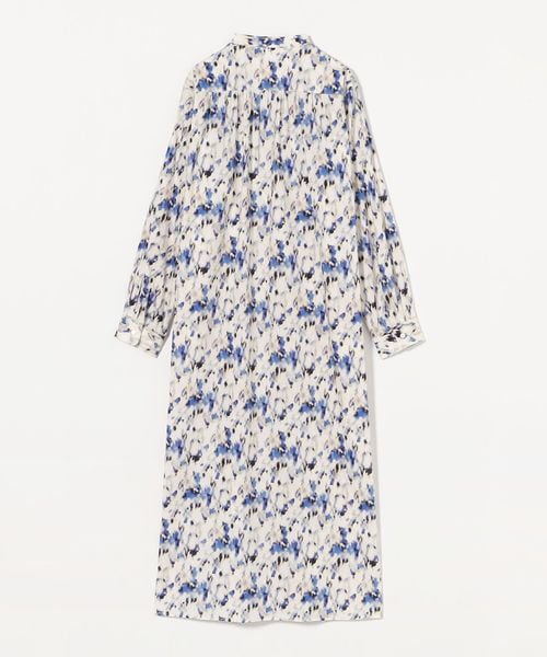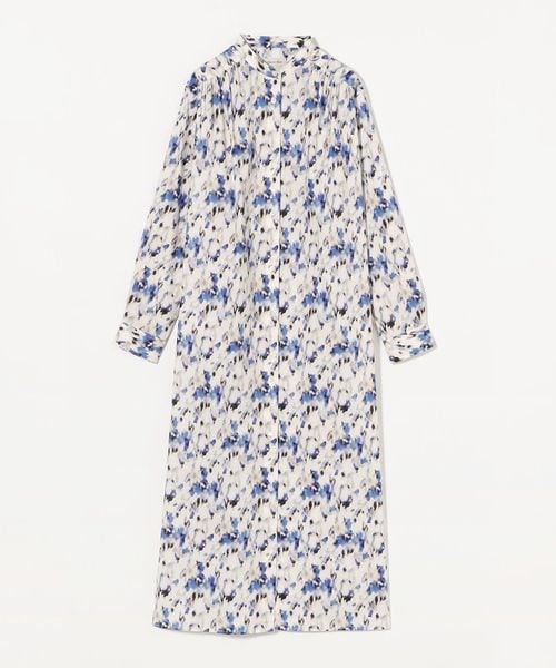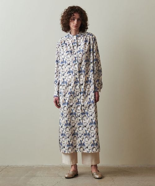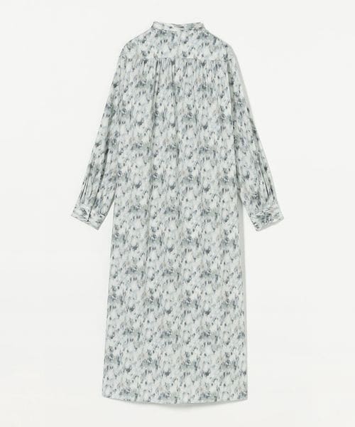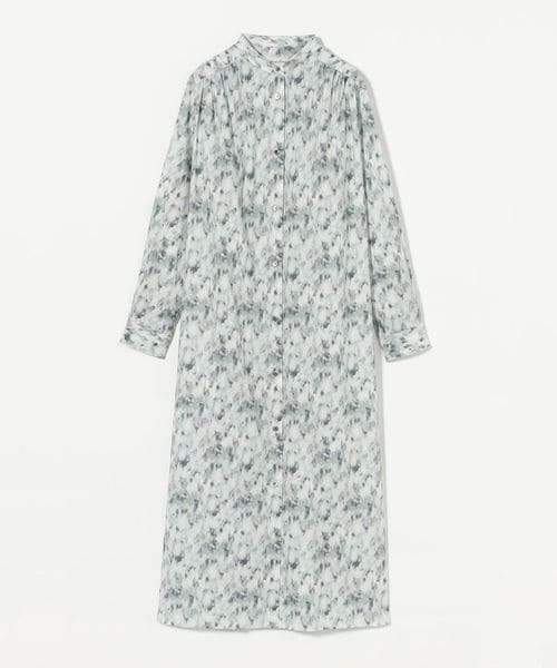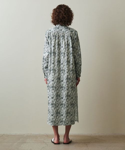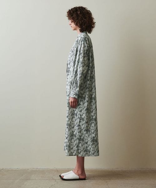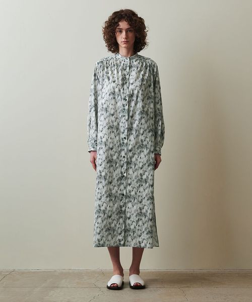 上品なバンドカラーと、肩部分のギャザーをポイントにした、ロングワンピース。