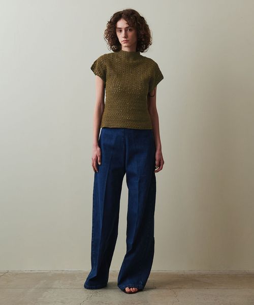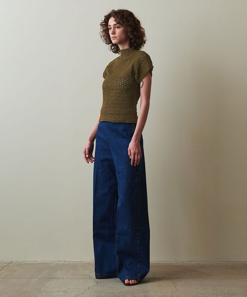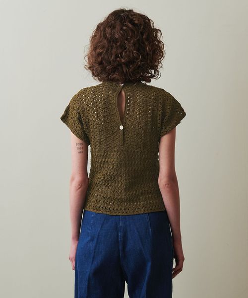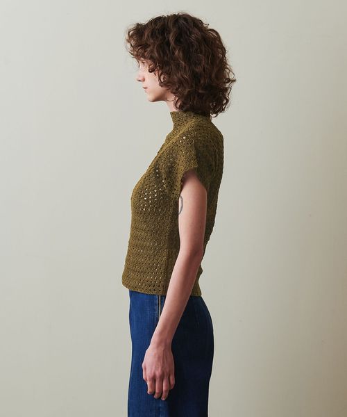 やや高めのネックと、キャップスリーブが特徴のニットトップス。