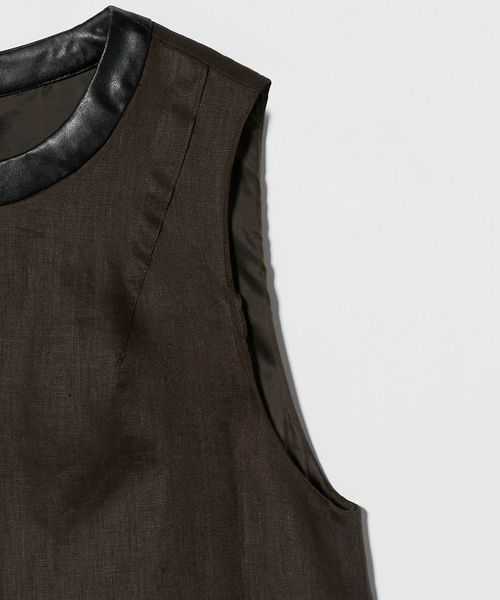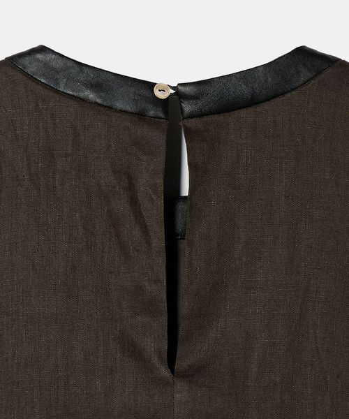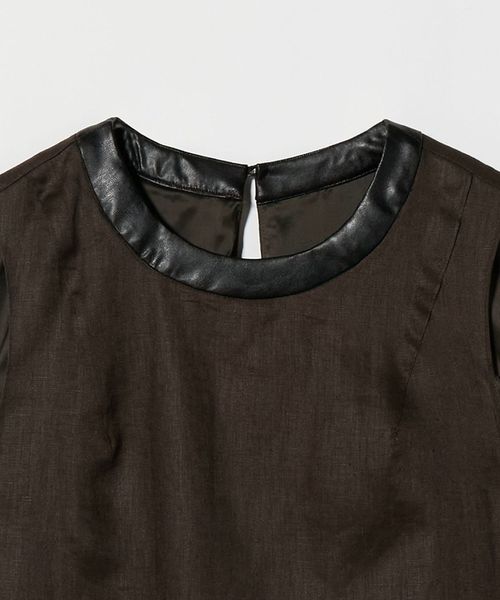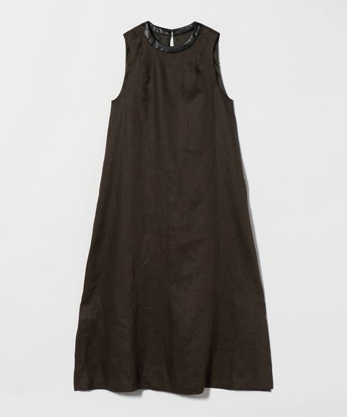 ネック部分の合成皮革のアクセントをポイントにしたシンプルなデザインのワンピースは、涼やかなリネン素材がシーズンムード溢れる一着。