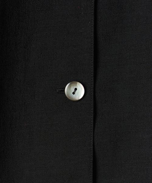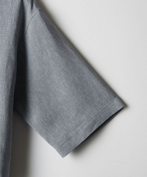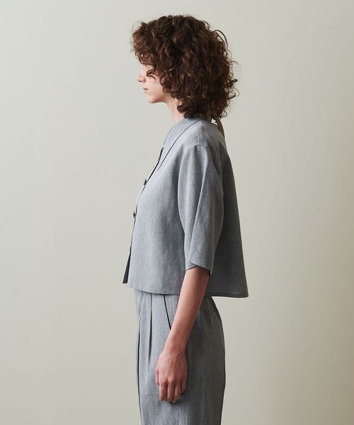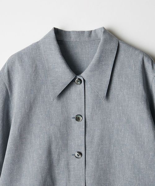 シャンブレーのような奥行きのある色合いと、ネップ感のある風合いがナチュラルな印象ながら、肘あたりまでの5分袖にシャープな襟がシックな雰囲気です。