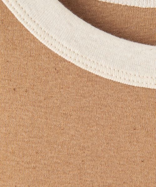 オリーブはソリッド、オフホワイトとブラウンは衿ぐりと袖ぐりをリンガーデザインにしアクセントをプラス。