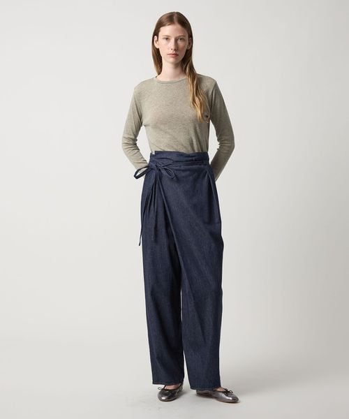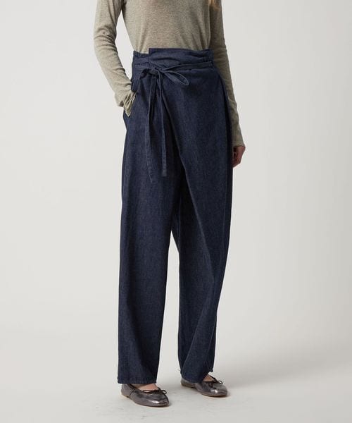 表面感のきれいなライトオンスデニムを使用した、クロスオーバーデザインのパンツ。