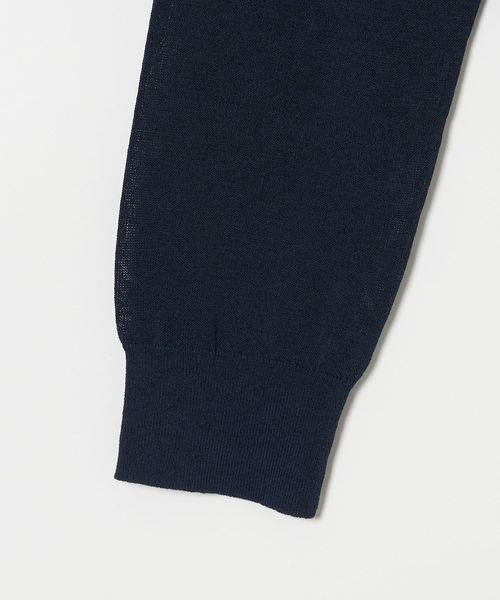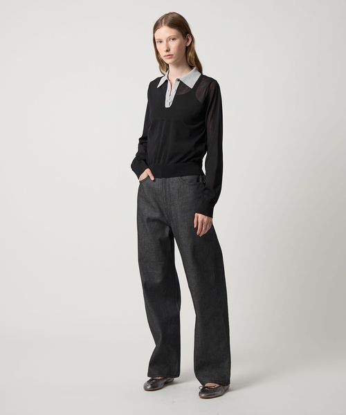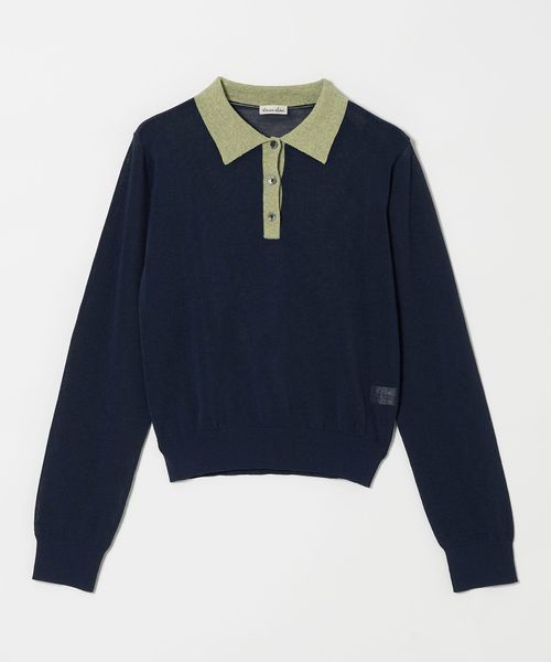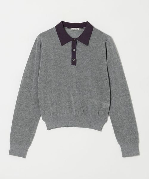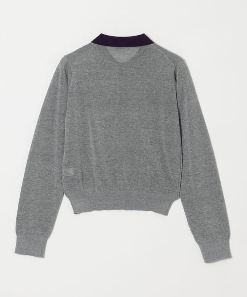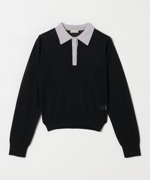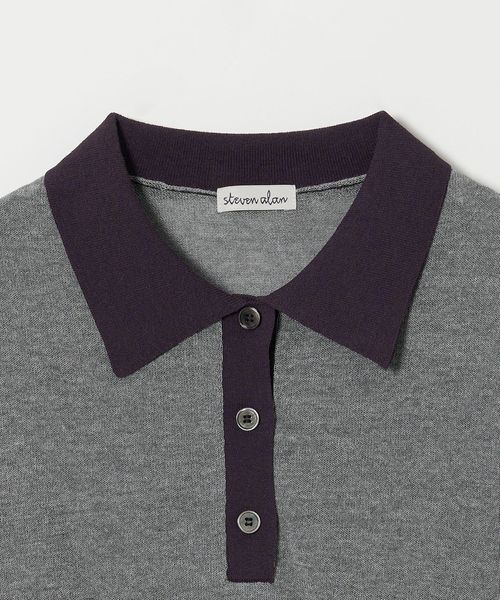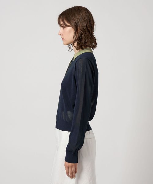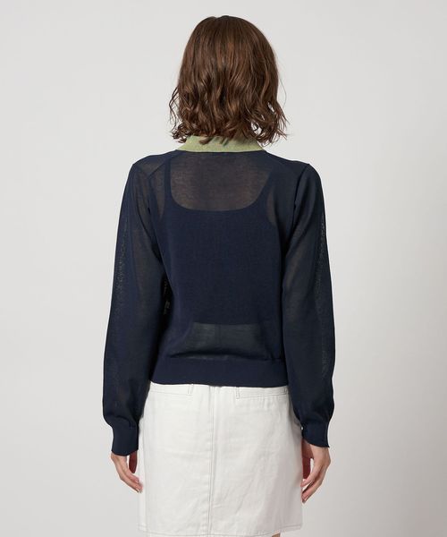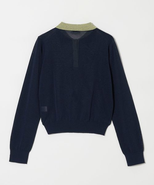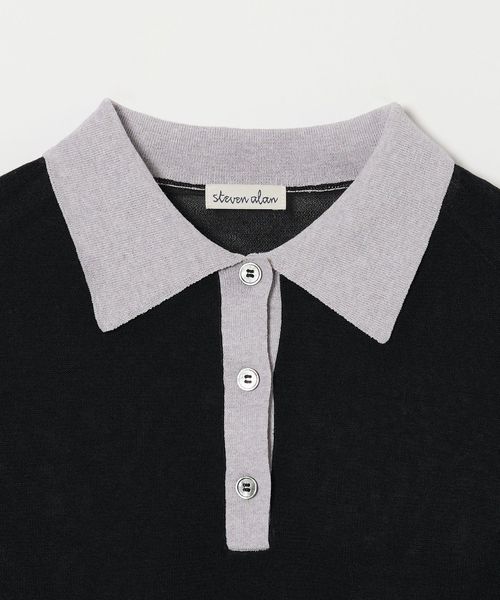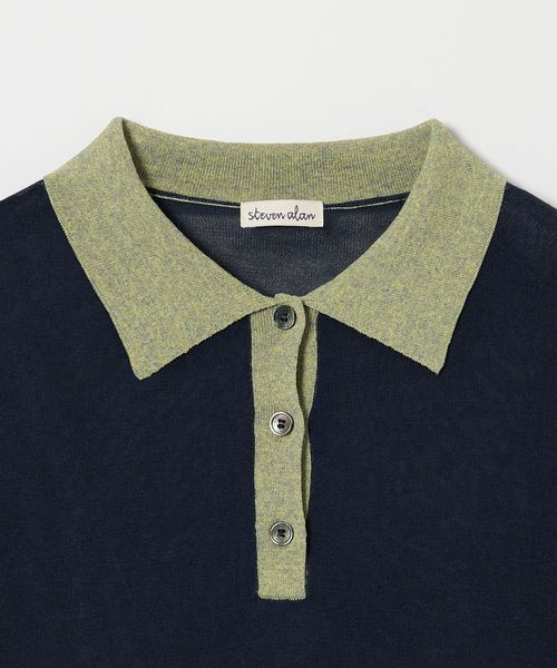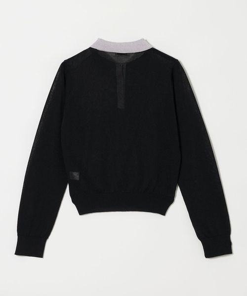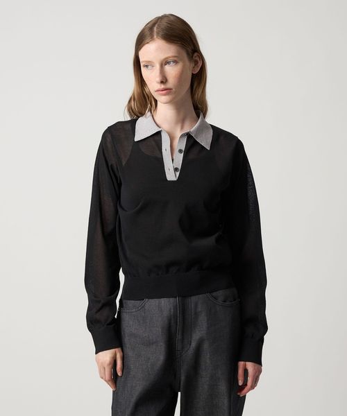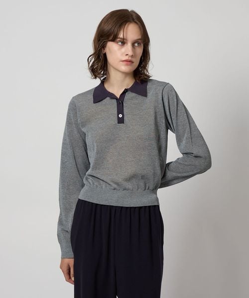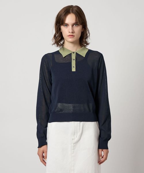上品さのある配色デザインとやや透け感のあるシアーな編地がモダンな雰囲気のポロニット。