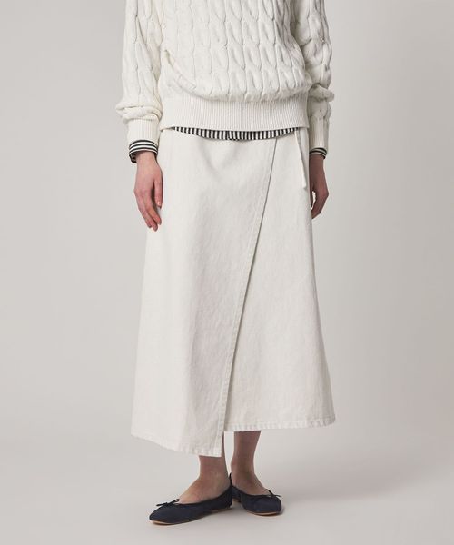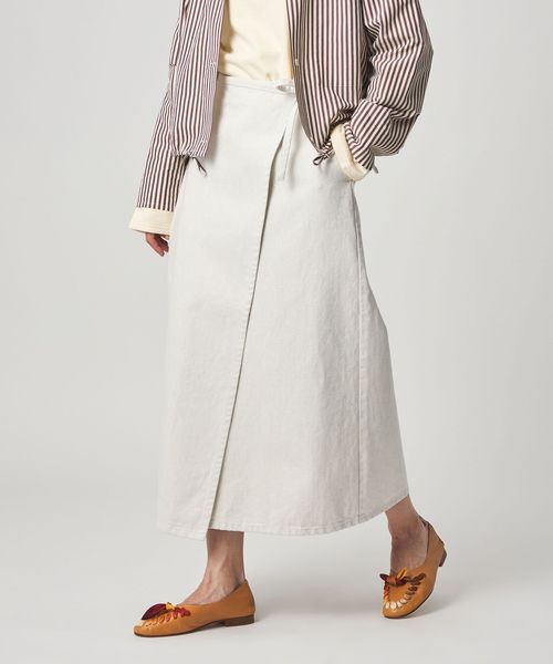 フロントの紐で結ぶラップ仕様がクラシカルな雰囲気を漂わせるデニムロングスカート。
