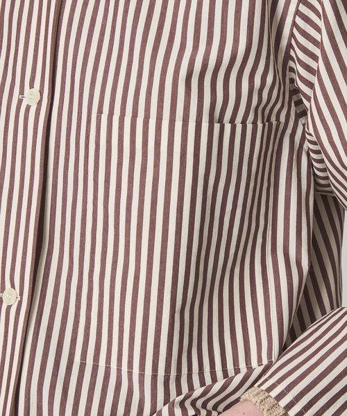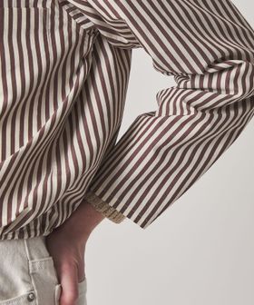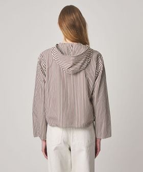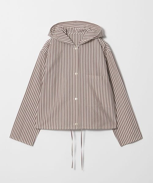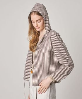 オフホワイトのような落ち着いたカラーをベースにフェード感のあるストライプがどこか趣のある、フード付きシャツ。