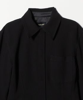 シャープな衿や長めのカフスに、胸元にポケットを付けたデザイン。