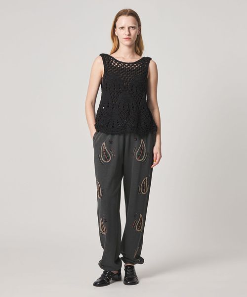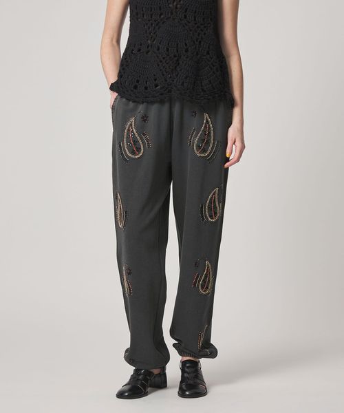 イージーなスウェットパンツにビーズの刺繍が施されたパンツ。