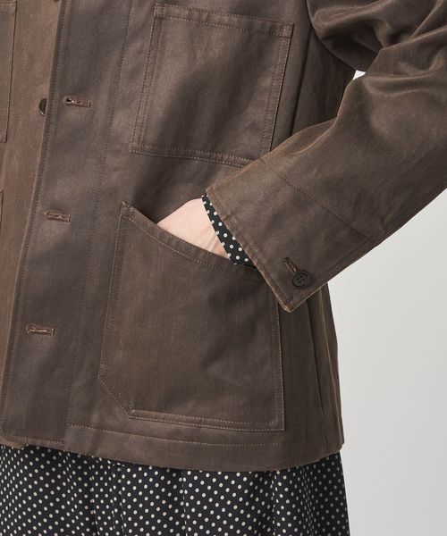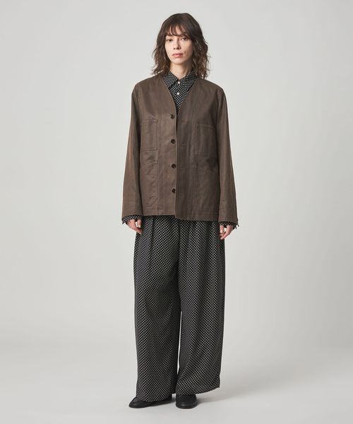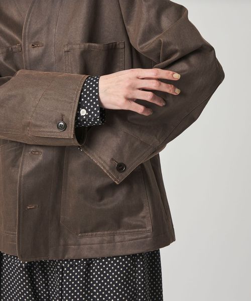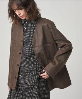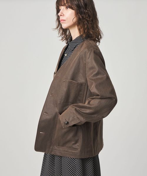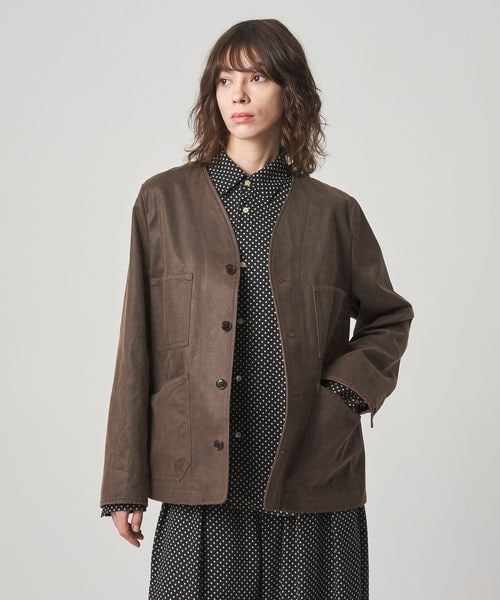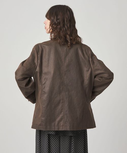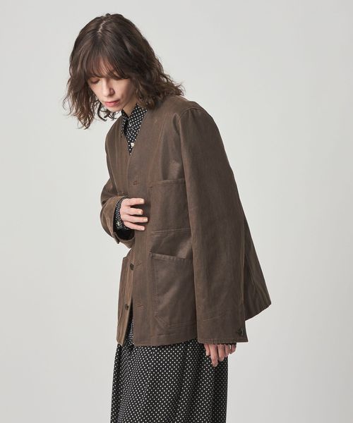 ヴィンテージのような趣のある色合いが目をひく、ノーカラージャケット。