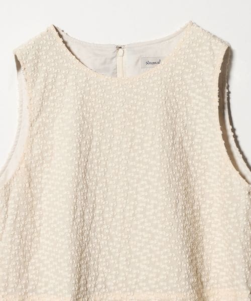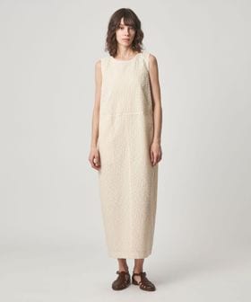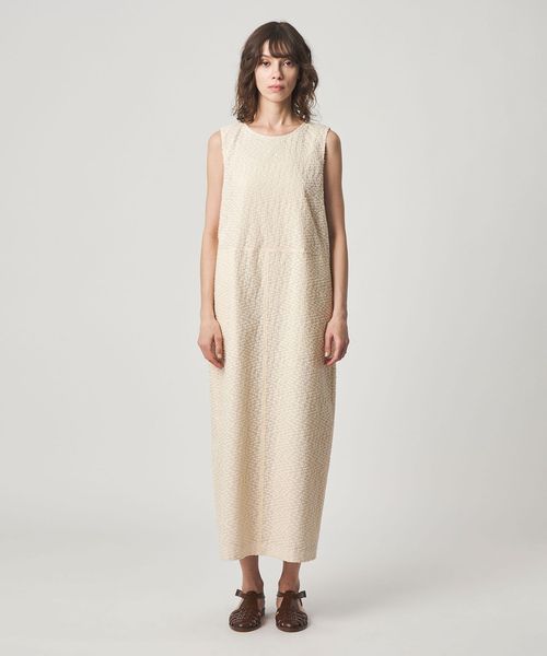 スカート部分にはやや丸みを持たせたコクーンシルエットを取り入れ、シンプルなノースリーブデザインが素材の風合いを引き立てます。
