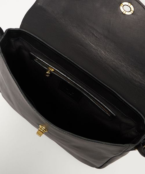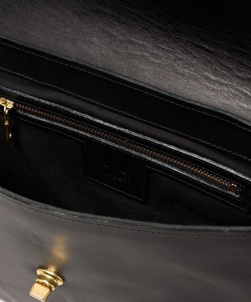 留め具や、フラップの開閉に使用されたゴールドカラーのパーツも控えめなアクセントとして際立ちます。