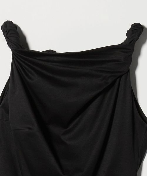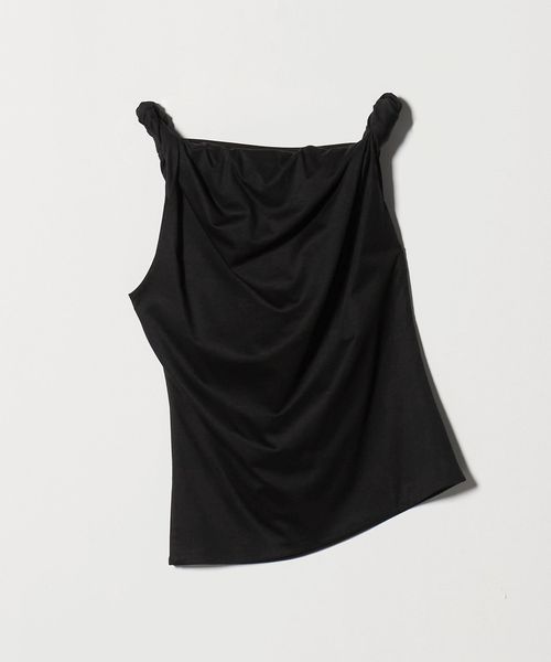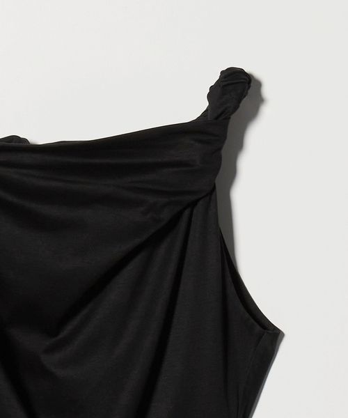 ツイストストラップのディテールと、片方の袖が肩から落ちる柔らかなアシンメトリーが特徴で、リラックスしながらも立体的なシルエットが美しい一着。