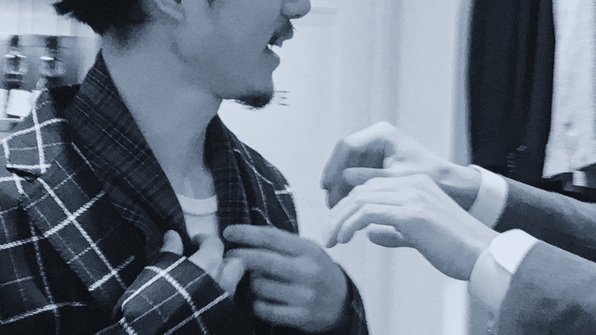 - 「お客さまが今着ていらっしゃるガウンの上から羽織っていただいてもカッコイイと思います。このような着方をしたことなかったのですが、とても新鮮ですね」