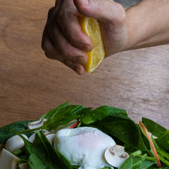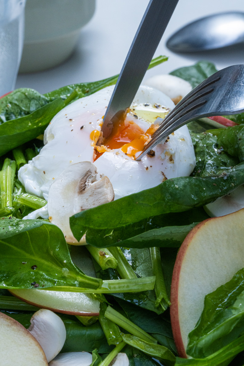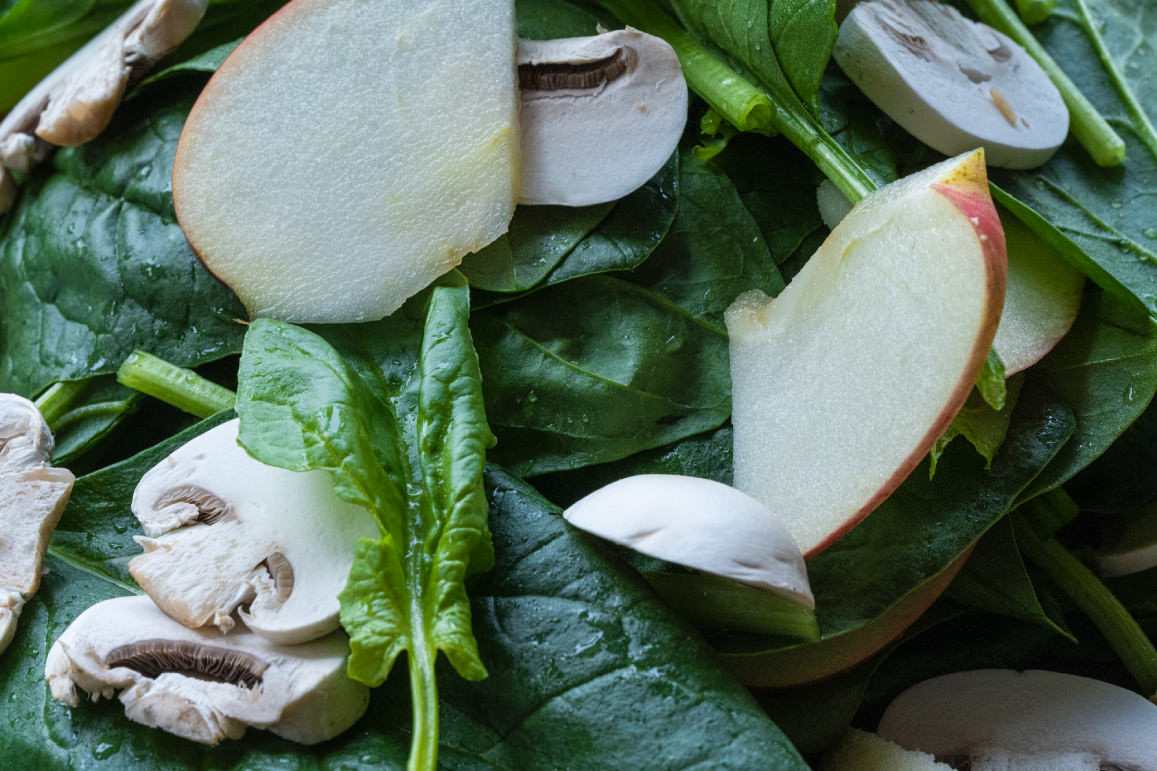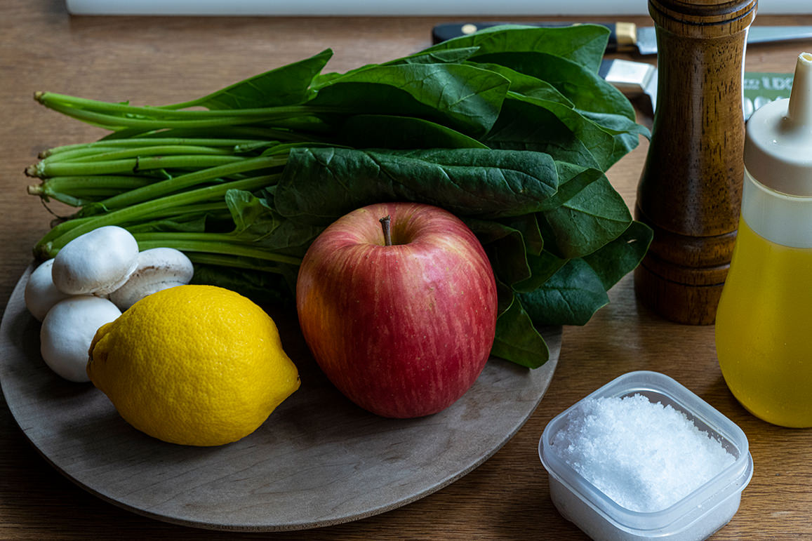 栄養もたっぷりで腹持ちもいいほうれん草を使った簡単サラダを紹介。材料もシンプルで、用意するのは、ほうれん草にリンゴ、ホワイトマッシュルーム4-5個にレモン、そしてオリーブオイルと塩胡椒のみです。もう少し時間があるなら、ポーチドエッグをサラダに載せるとさらに満腹感を味わえます。