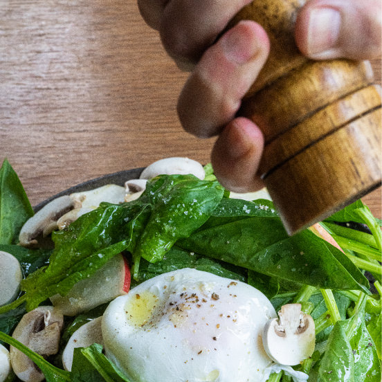 最後に塩をかけて、黒胡椒をゴリゴリ挽いて完成。シンプルな味付けなだけに塩や黒胡椒にこだわると数段美味しくなる。原さんは大粒の天然海塩のフルール・ド・セルと胡椒はマリチャと呼ばれる香りが豊かな黒胡椒を使用。
