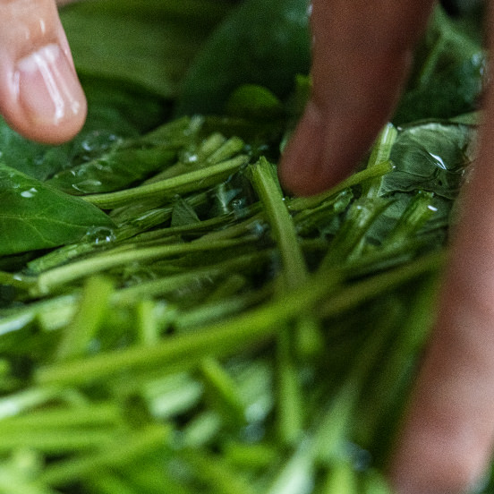 まずはほうれん草の葉っぱの部分をちぎり、茎の部分はザクザクと切る。切ったほうれん草は水に1分ほどつけ、シュウ酸を抜く。