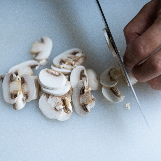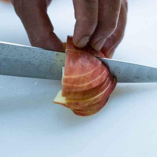 ほうれん草を水につけている間にリンゴとホワイトマッシュルームをサクサクと薄くスライス。