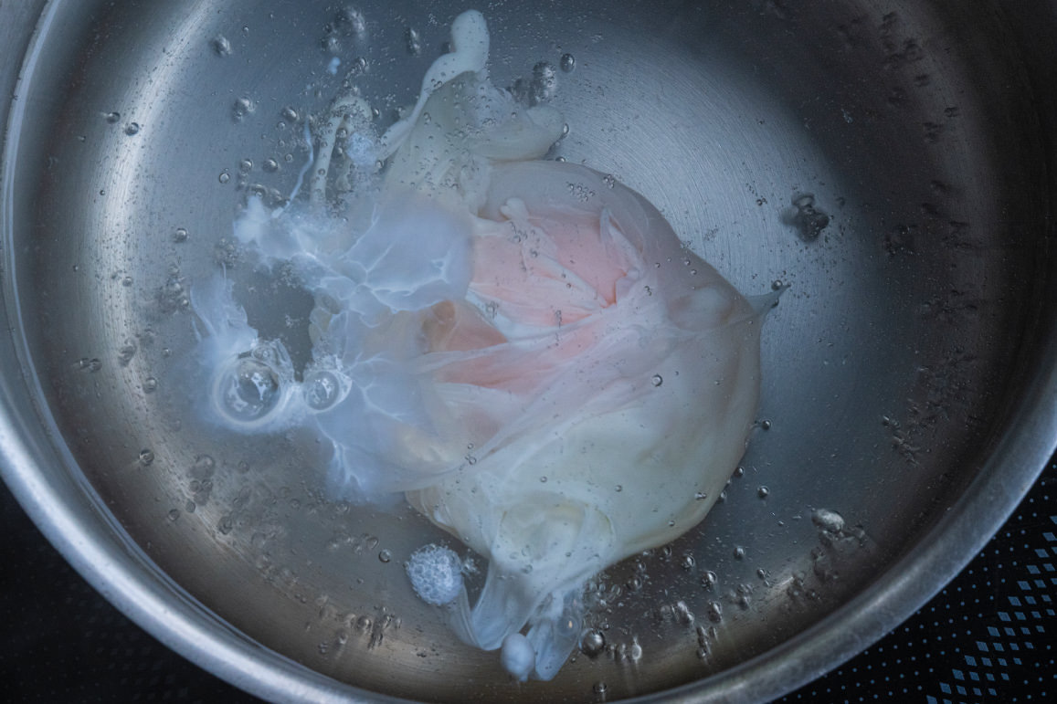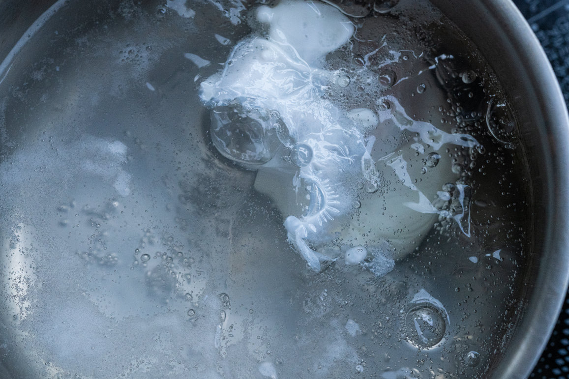 お好みでポーチドエッグも。一度水を沸騰させ、沸騰したら弱火にして、お酢を大さじ一杯。かき混ぜた後に卵を入れる。