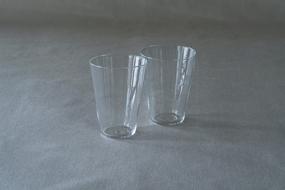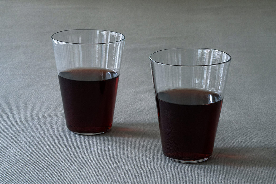 「香川県にガラス工房を構える蠣﨑マコトさんのコップ。すっと整ったデザインや、宙吹きならではの柔らかいフォルムとクリアで透明度の高いガラスのコップはとにかく使いやすいのが特徴です。日常的に味わえるナチュラルワインは、ステムがついたワイングラスだけでなく、こうしたコップに注いでラフに楽しむのもいいですよね」