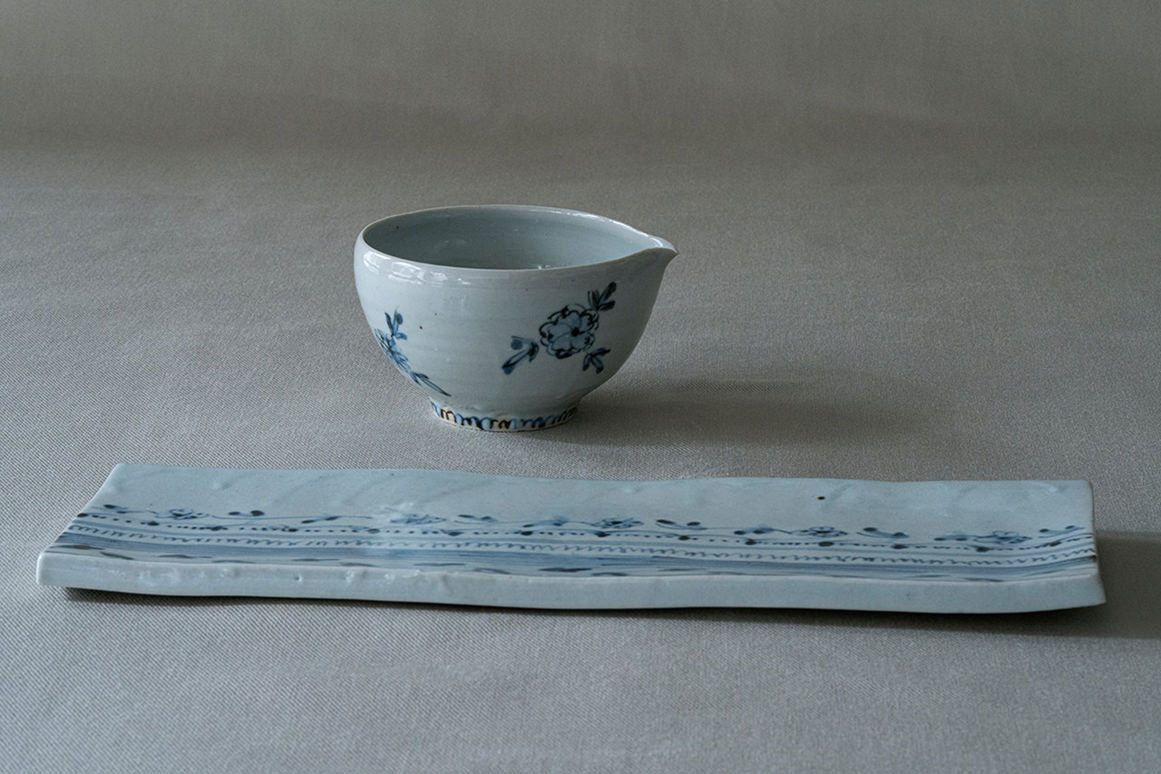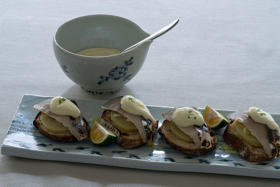 「長方形の染付の器をみると、秋刀魚や鯖といった焼き魚を盛り付けるのかな? とイメージしてしまうと思います。佐藤もも子さんは、落ち着いた呉須の色味で骨董のような雰囲気がありながらも、少し洋風なデザインも持ち合わせた陶芸家さんです。食卓に馴染みやすく、和にも洋にも相性は◎。なので今回は同じ魚料理でも、しめ鯖をブルスケッタのオープンサンドで意外な組み合わせを楽しんでみました」