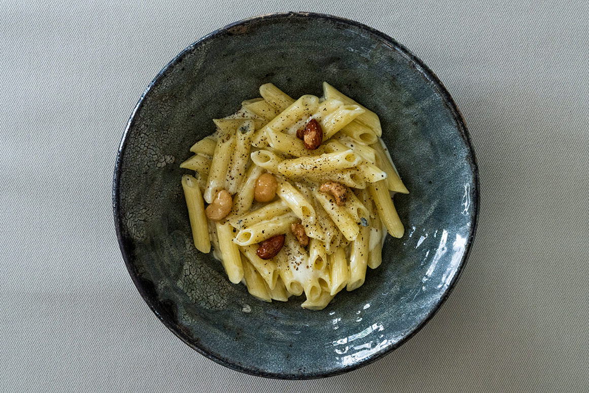 「ショートパスタを土ものの器で楽しむ提案になります。ゴルゴンゾーラチーズを使ったクリームパスタのベージュとグレイッシュな小野象平さんの浅鉢のコーディネートはまさにアースカラーの組み合わせです。小野さんは自ら山に土を掘り、釉薬の原料も一から作っているため、グレーの色味も非常に奥深いのが特徴で、食材選びが楽しくなる作家さんです」