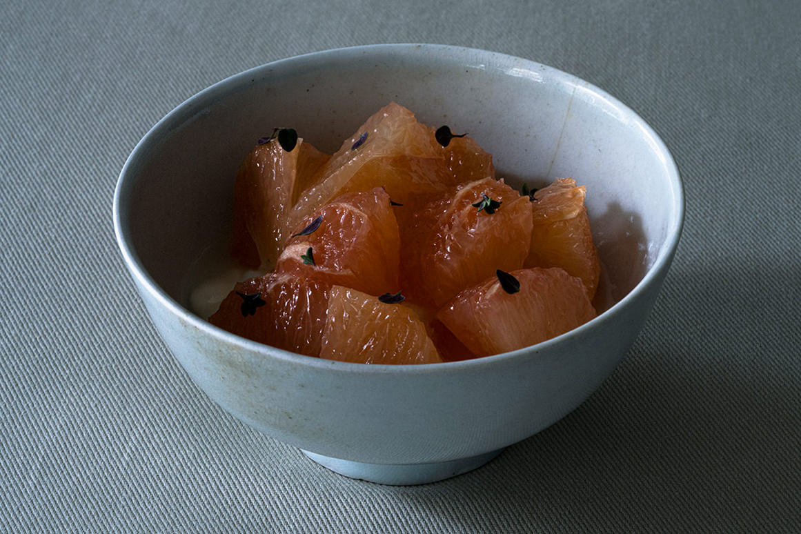 「どこか清楚で⾼潔なイメージのある李朝⽩磁をベースに新しい白磁の制作をおこなう陶芸作家・小泉敦信さんの茶碗。ある種クラシックな佇まいの茶碗を茶碗としてではなく、ボウルとして使ってみるのはどうでしょう? 若干青みがかったニュアンスカラーが、ピンクのグレープフルーツをより一層を引き立たせます。天気のいい朝にぴったりのフルーツサラダですね」