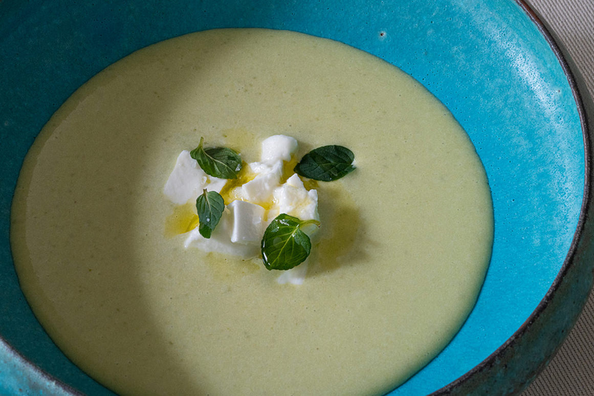 「繊細な薄さと軽さと美しいターコイズブルーが魅力的な器は陶芸家の鈴木麻起子さんが手がけるラ・メゾン・デ・ヴォンのボウル。この色彩からインスピレーションを受けて盛り付けてみたのは、グリーンピースとモッツァレラチーズを使った冷製スープです。ブルーとグリーンの色彩は彩り鮮やかで、まるで西洋画のようです。爽やかなターコイズブルーの器は、色々な料理との相性も良い。それに軽くて使いやすいのも重宝する理由です」