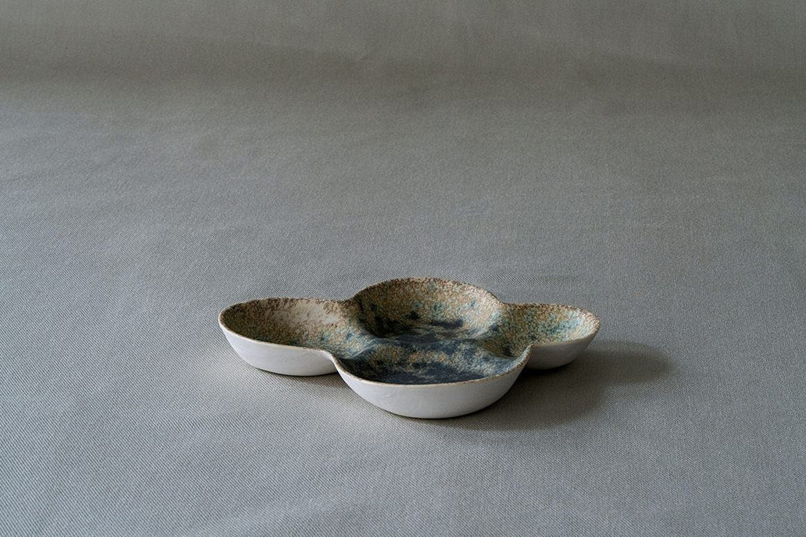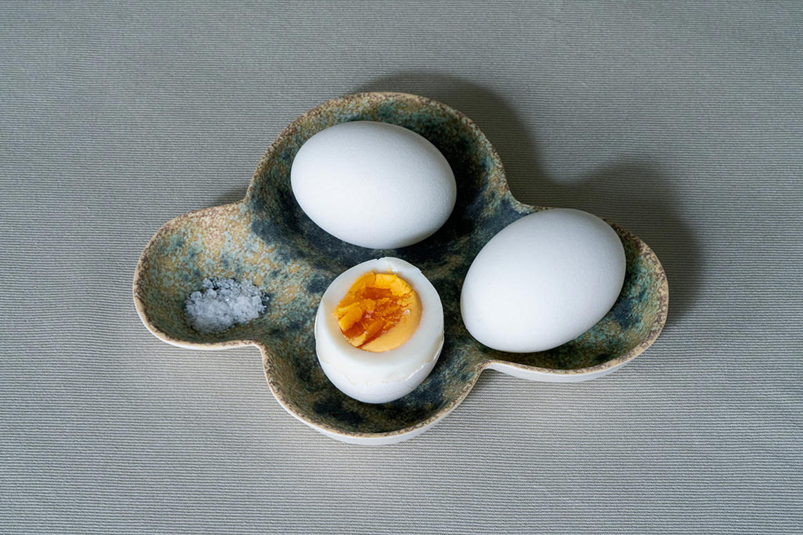 「デンマークを拠点に活動するグーリ・エルベックゴーさんは日常的に使える器から、写真のようなちょっと変わったフォルムのアートピースまで制作する作家さんです。4つ葉のクローバーのような形をした一風変わった器には、なんとでもない食材、例えばゆで卵なんかを合わせてみます。不思議とちょっとリッチなゆで卵に見えるのは、この器のおかげですね」