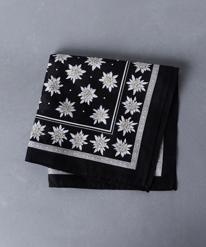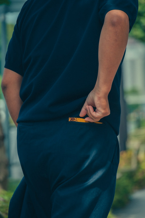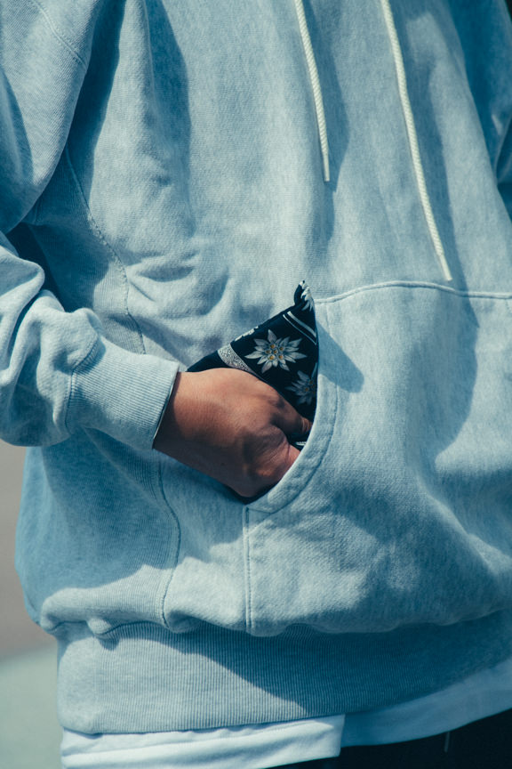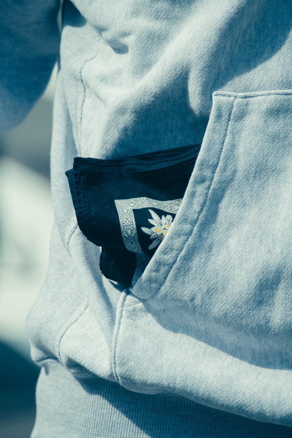「マナーとしてもスタイリングとしても、カジュアルでのハンカチも基本はドレスの考え方と一緒なのかもしれませんね」。そう教えてくれたのはチーフクリエイティブオフィサーの松本真哉さんだった。ポケットチーフのように、フーディーのポケットにもハンカチを差し込むなんて考えたこともなかった。でも、グレーのフーディーのポケットからのぞいた黒のエーデルワイス柄のハンカチのカッコよさを見れば、その発言にも納得だ。もちろん、ハンカチを収める位置としては定番のバックポケットだって忘れてはいけない。メンズバイヤーの内山省治さんは、オールネイビーのコーディネイトに鮮やかな黄色のハンカチを合わせていた。「ハンカチを選ぶ基準は色々ありますがネクタイも大好きなので、それを選ぶ感覚で色柄を決めることも多いですね」とのこと。ユナイテッドアローズのスタッフにとって、ハンカチはもはや日々のコーディネイトに欠かせないアイテムなのである。普段洋服では取り入れにくい柄物や色もの。しかしハンカチというポイント使いであれば、確かに大胆なものを気分によっては選びたい。ドレススタイルにおけるVゾーンが、現代のカジュアルスタイルではこんなところに潜んでいた。