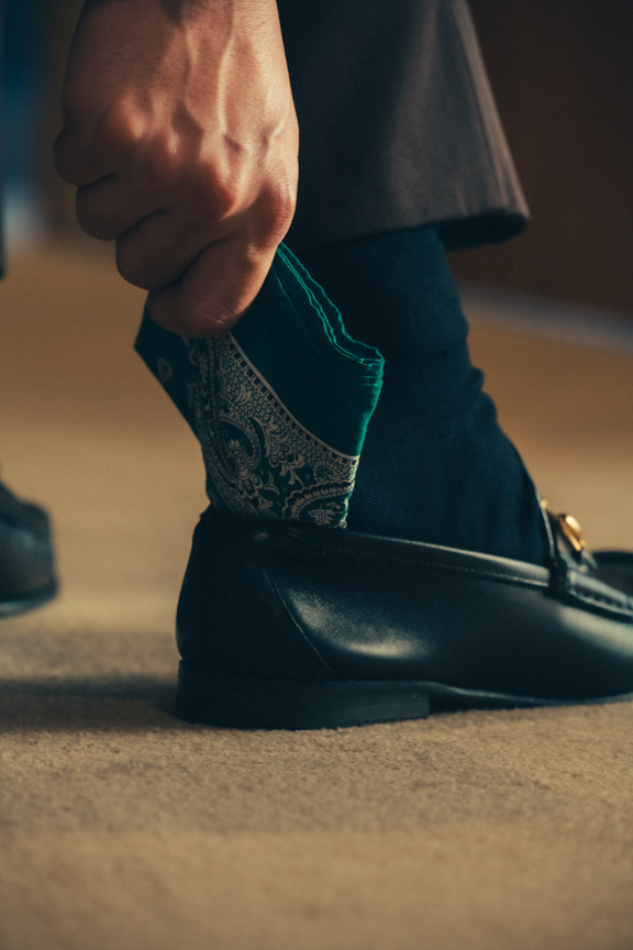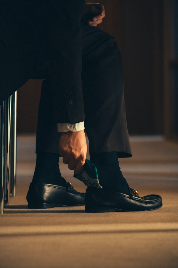 そんな使い方今まで見たことも聞いたこともなかった。ただ、ユナイテッドアローズのスタッフの中ではどうやら常識らしい。確かに靴べらがないときには、無理やり指を入れて履くか、足を無理やりシューズにねじ込むか、コツコツして徐々に入れていくしかない。でも、どちらもカッコいいとは言えないしシューズにダメージを与えてしまう。ハンカチを使えば踵もシューズも傷つかないし、何より所作がスマートだ。ポケットからハンカチを取り出し、スッと踵とシューズの間に入れる。ポイントは折りたたんだハンカチの角をインソールにつくかつかないかの位置に入れること。それより深いと抜けなくなるし、浅いとそもそも入らない。これみよがしにハンカチを使うのではなく、あくまで周囲の注目を外しながら自然体で行うことが大切らしい。