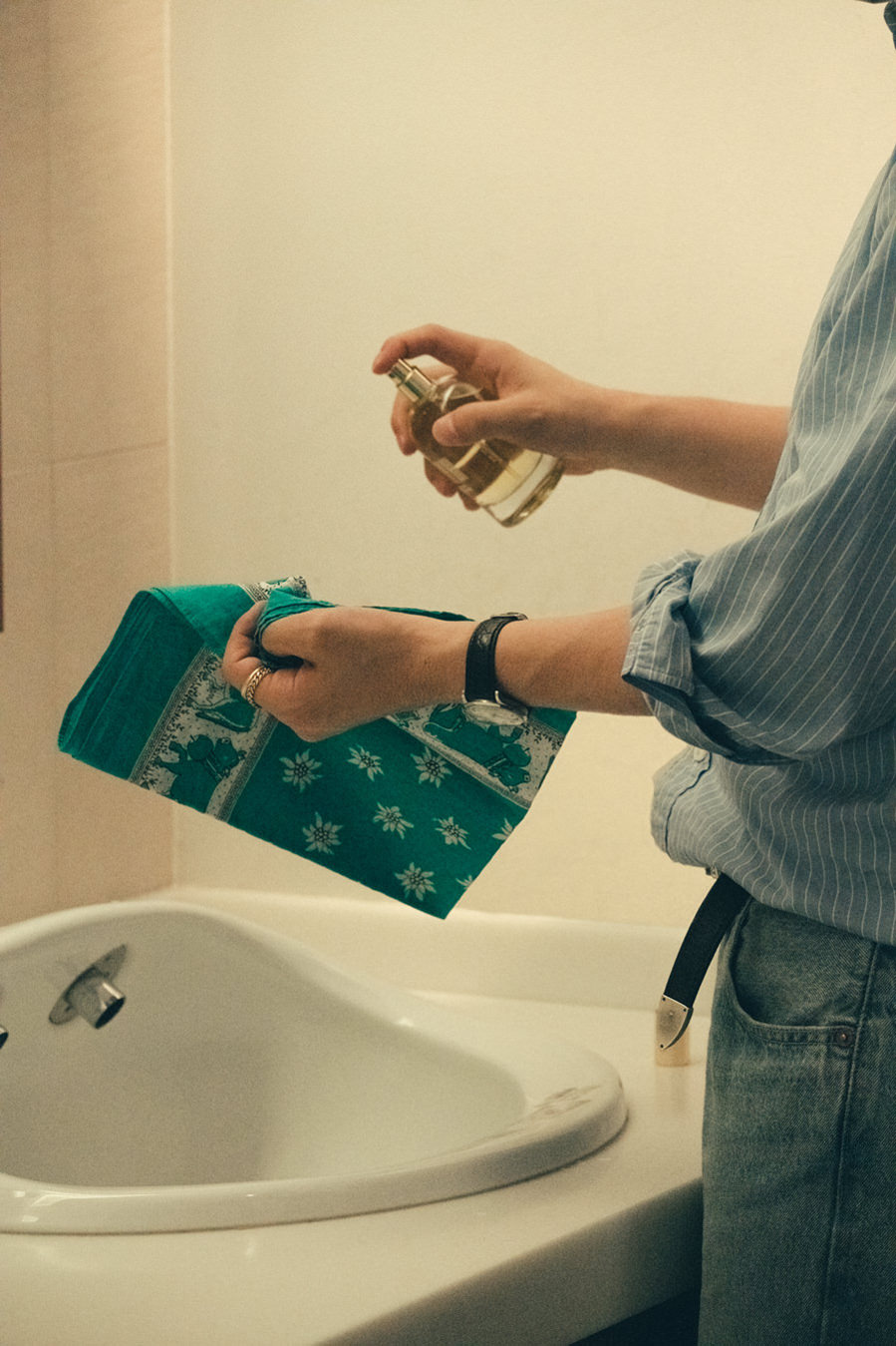 とても恥ずかしい話だけど、今年32歳になる“立派な大人”の僕は今までハンカチを持つ習慣がなかった。こんな時代だというのに、手を洗った後には髪の毛をかき上げるようにして拭いたり、当たり前のようにペーパーを使ったり。そんなのは不衛生だしエコじゃないし、カッコ悪い。それでもなかなか抜け出せないでいた。そんな僕がハンカチを持とうと思ったきっかけは、ユナイテッドアローズのスタッフたちのハンカチ使いを目の当たりにしたからだった。拭くのはもちろん、滑らせたり、かけたり、香らせたり、合わせたり……。そこには僕の知らないハンカチの世界が広がっていた。彼らにとってハンカチはファッションであり、マナーであり、生きざまだった。UA流のハンカチ使いを知ったのなら、もうハンカチを持たずにはいられない。