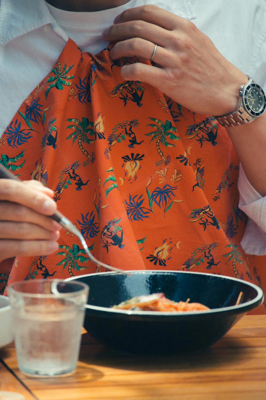 食事のときこそ人柄が出るとはよく言ったもの。何を注文するのか、注文の仕方、周囲への気配り、テーブルマナーなど、あらゆるところでその人となりがわかる。ユナイテッドアローズのプレスを務める藤原さんと一緒にランチした際、「パスタどうですか?」という提案にYESと応えたものの、彼は白シャツ。若干不安になったのだが、いざパスタが届くと、彼はバックポケットからハンカチを取り出し、当然のようにナプキンの代わりに使っていた。その所作やマインドがあまりにカッコ良かった。美しいマナーとして、サステイナブルなマインドとして、食事中にもハンカチを持とう。そう強く心に誓った昼下がりだった。