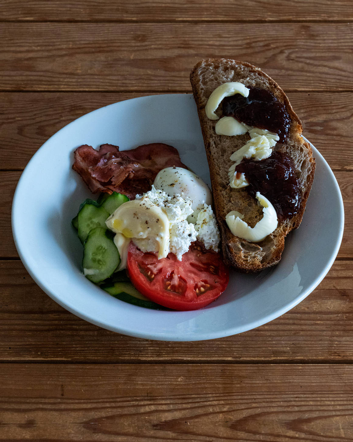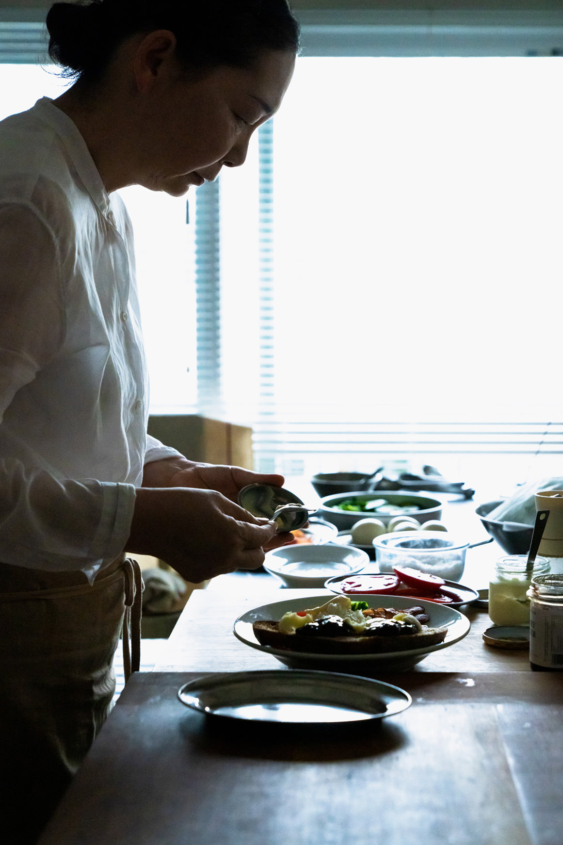 「例えば、一人分の朝ごはんだとこんな感じ。オーバルのお皿は本当に便利ですよ。丸皿と比べても、食材を並べるだけで、見栄えが悪くないですし、どこかカジュアルさのある気軽な朝ごはんになります。オーバルの形はいろいろなもののハードルを下げてくれる。並べればいいみたいなノリがあるんです」