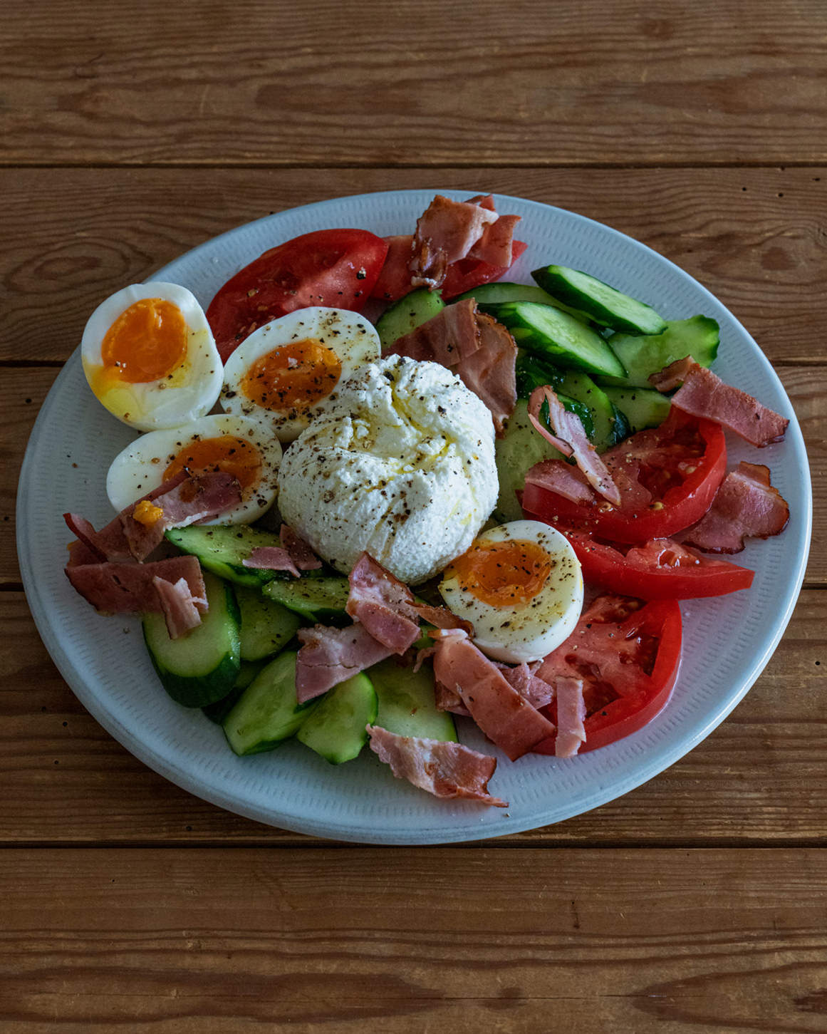 「同じレシピでも、お友達を家に呼んだ時に出すような盛り付け方はこんな感じです。みんなが取りやすいように平らなプレートに、とにかくダイナミックに盛り付けていきます。きゅうりを真ん中に置いて、その上に水分を切ったカッテージチーズをドカンとおいてしまう。ゆで卵もこの場合は切り、ちょっとした賑やかし役を演じてもらうのがいいかなと思います」