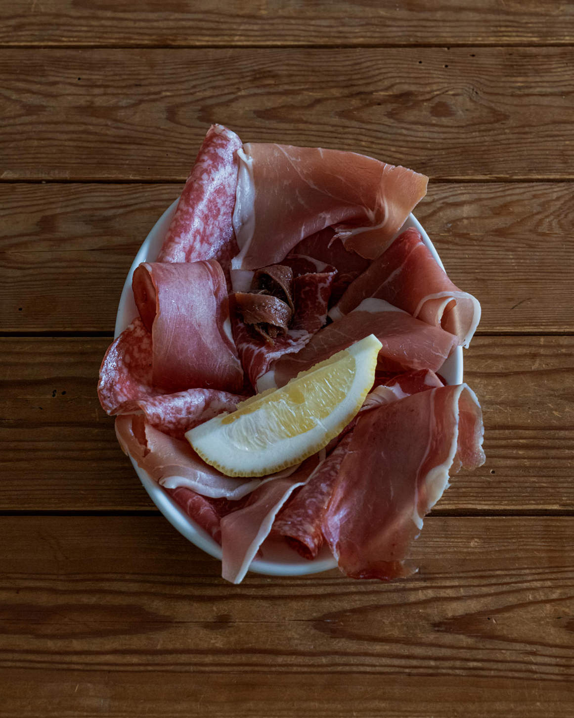 「サラミや生ハムの盛り付け方。これもオーバルのプレートを使っています。ポイントは少ない量を多く見せること……。そのために空気を入れてふんわりと。私の個人的なリサーチでいうと、結構平らにおいてしまう人が多いとデータがありまして。平らにおいてしまうとあまり格好がつかないんですね。クシャッとおいてお皿の傾斜を活かして、リム(淵)のところまで使う。徳用パックで購入しても、こういうところをパッとやろうとしないで、手間をかけるのが大切なわけです。すると不思議と『美味しそう〜』ってなるんですね」