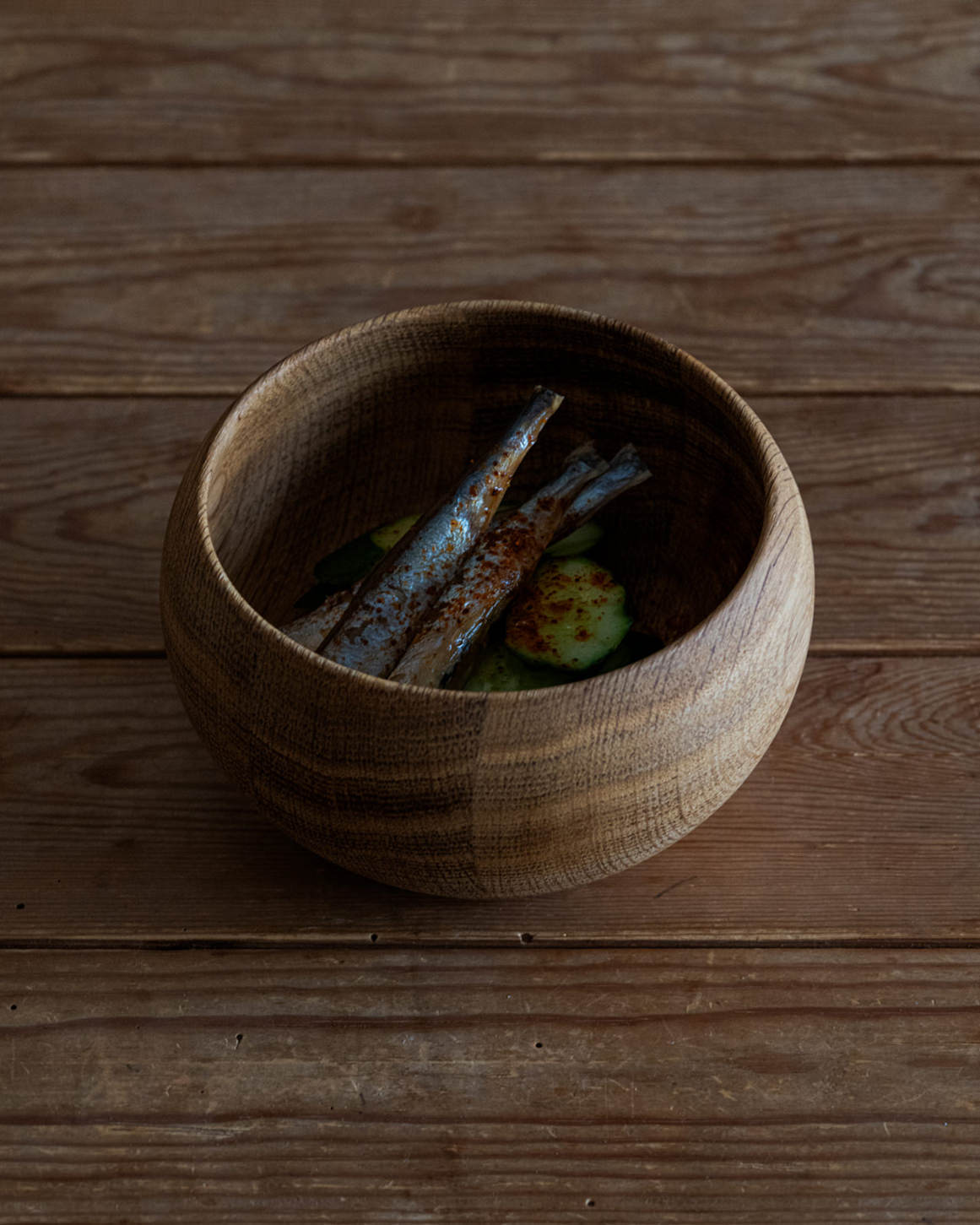 「きゅうりとししゃものオイル漬けに唐辛子を。酒の肴ということで、こういう器に盛るとどこか“もったいぶった”感じになりますよね。ちびちび食べたくなる。中身は“あの”きゅうりなんですけどね・・・。美味しそうと感じることへの差というのは、ちょっとしたことの積み重ねなんです」
