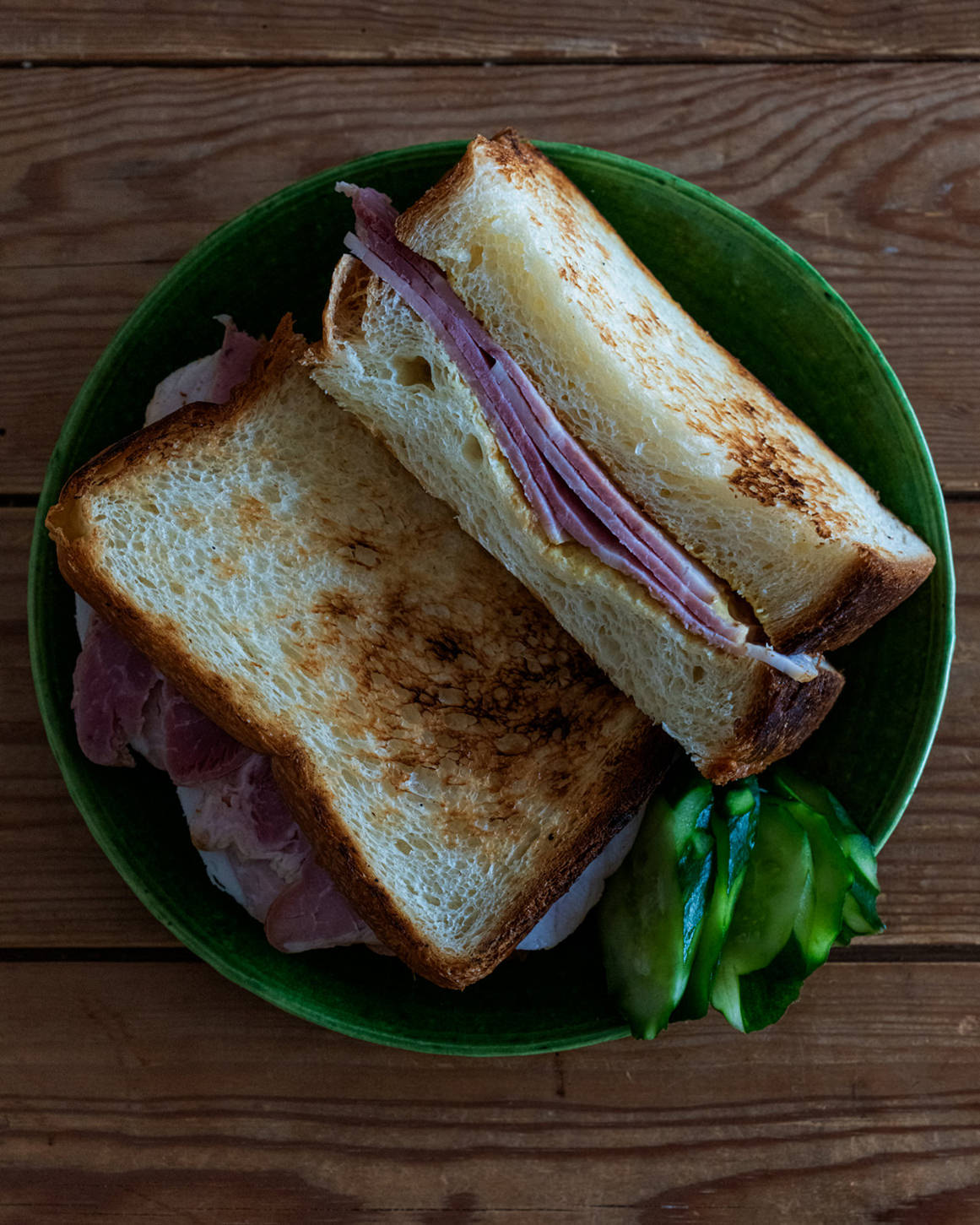 「ハムとマスタードのシンプルなサンドイッチ。パンをトーストして、マスタードをたっぷり塗って、これまでもかというぐらいハムを挟む。お皿はあえて小ぶりのお皿を選んでいます。大きいお皿よりもサンドイッチや食パンは、お皿が見えないぐらいのサイズ感がいいですよね。ピクルスの代わりのきゅうりを添えて」