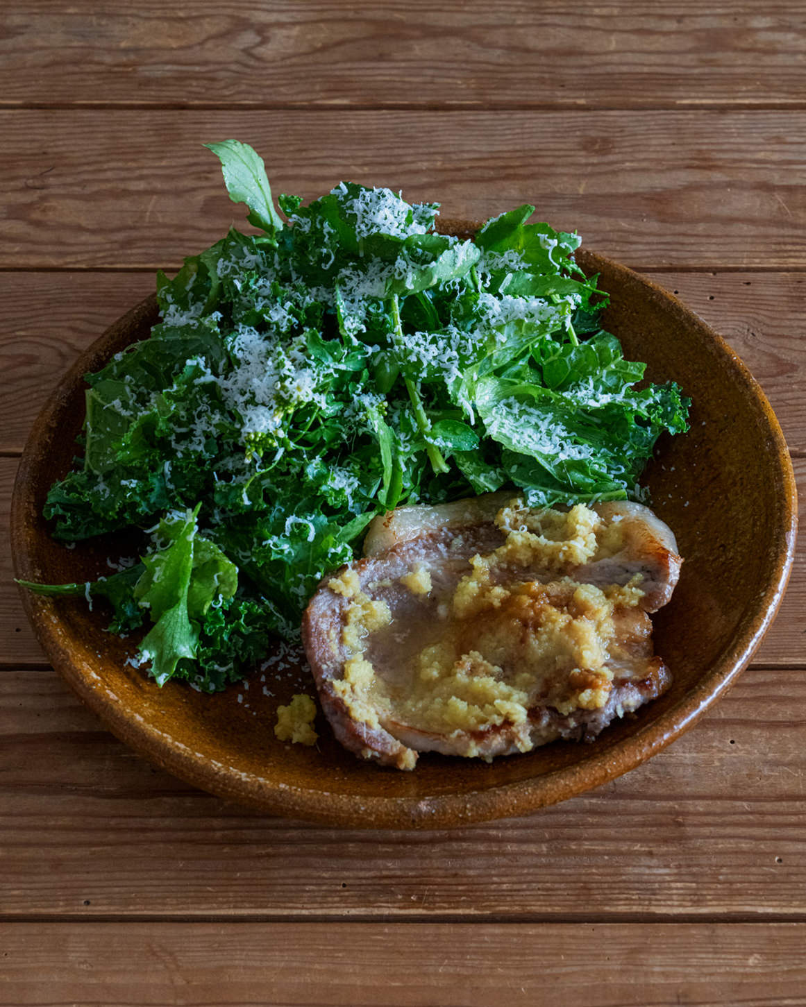 「メインはポークソテーになるのですが、まだ積むの?というぐらいの野菜で盛り付けます。お肉をまるで野菜の添え物のようにすると、お肉の量が少なくても見栄えがいい。グリーンサラダだけど、ボリュームアップするためのお肉をトッピングするという逆転の発想に近いかもしれません。器はスペインの友人から送ってもらった土物の雑器を使っています。1ユーロぐらいで譲ってもらった器ですが、質感と色目がポークソテーに似合いますよね」