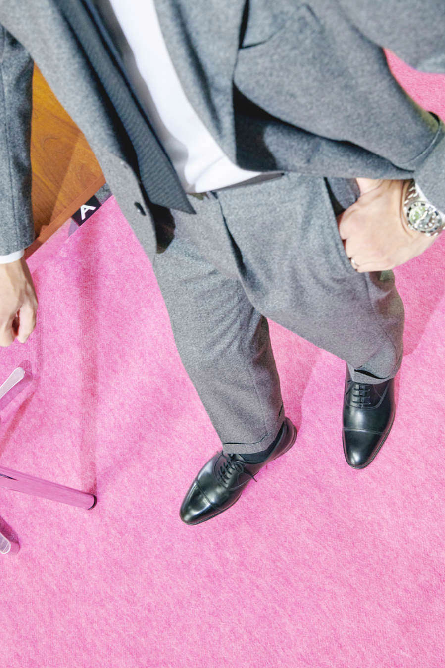 「とんでもなく価値観が変化してしまわない限りは、ずっと永く付き合っていける究極の定番シューズ。内羽根のストレートチップ自体は、フォーマルな場にもふさわしい格式のあるシューズのひとつでもあります。そのなかでも<ジョン ロブ>の「シティ2」は、もっともスタンダードな位置づけであり、最高のシューズであることは間違いありません。靴が持っている気品を生かすため、モノトーンで全体をまとめていますが、正統派な装いが改めてかっこよく新鮮に映るいま、こうしたマスターピースを捻ることなく合わせるストレートなかっこよさは健在です。また、こうしたシューズはやはりドレススタイルにこそ合わせるべきものですが、もう少しファッションとしてスタイリングを捉えたときには、ジーンズのような、カジュアルなパンツと合わせることでギャップが生まれて楽しいスタイリングが生まれるかもしれません。TPOはわきまえつつも、ルールを破ってみたり、あり得ないことがあり得たりしたときに可能性が広がりますよね」