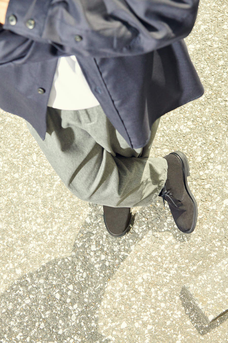 「チャッカブーツは長く愛され続けているものなので、改めてということでもないですが、品よく履いていただけるミドルカットのブーツって実はほかにあまりなかったりするんですね……。そんな中で<チャーチ>の「RYDER」は最もスタンダードなチャッカブーツと言えます。ミドルカットだからこそ、パンツのレングスで印象も変えられます。例えばこれからのシーズン、厚手のソックスなんかを履いて、靴とパンツ、ソックスの合わせを楽しむこともできますよね。夏になったらショーツと合わせるのもいいですよね。と、合わせがいのある靴で、オールシーズン履けるブーツだと思います」