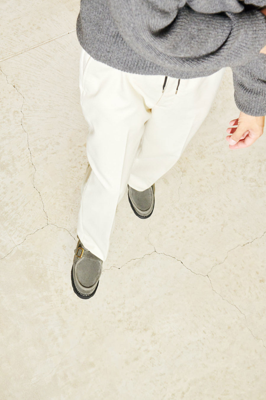 「由緒正しい歴史のあるモンクストラップデザイン。カジュアルなテイストの<パラブーツ>の「ミカエル」にこのモンクストラップを落とし込んでいるというところがまず絶妙です。ビットもそうですが、モンクストラップのバックルというのは、メンズ靴の中ではあまり多くない装飾性を施された靴の一つです。しかし、今回の靴は、カジュアルな佇まいのなかにある装飾性というバランス感。ちょっと足元で遊びを入れたい場合はこれぐらいのシューズをおすすめしたいですね。あとはグレースエードというところも新鮮に感じてもらえるポイントかなと思います。グレーと白のトーンでモノトーンのなかでもソフトでやわらかいニュアンスを大事にしています」