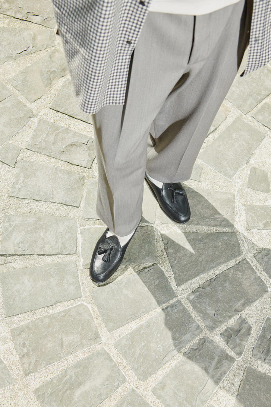 「足元にお洒落さを出したい、取り入れたいと思ったら、まずタッセルローファーをおすすめしたいですね。タッセルは、スタイリングに華やかさを出してくれる、本当に素敵なトッピングなんです。そういう意味ですごくファッション性の高い靴だと思います。ここで紹介しているタッセルはスタンダードというよりはちょっと変化球タイプのもの。室内履きの流れをくんだ薄いソールで華奢な作りになっているので、とてもエレガントです。だからドレープがきれいに出る太めのスラックスとのバランスがすごく優雅で大人っぽい。そこにハウンドトゥースのシャツジャケットを合わせて、ちょっとフレンチをイメージしたスタイリングになっています。エレガントさのあるタッセルだからフレンチテイストとも相性がいいと思うんですよね」