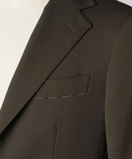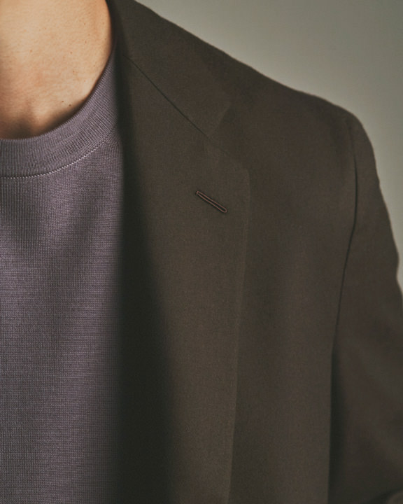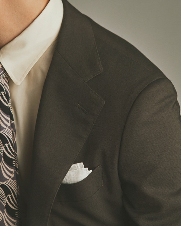 「ジャケットの印象を左右する要素はいくつかあります。フォーカスされることが多いディテールで言うなら、ラペルの形はもちろん幅や、ゴージラインの高さ。あとはポケットの形状などですが、今回着目したいのは、ラペルのステッチの有無。AMFステッチやピックステッチと呼ばれるものですが、これが施されたジャケットは、クラシックで正統的な印象を与えます。それに対してステッチ無しのジャケットはよりすっきりとして若々しい印象に。ステッチには装飾的な意味合いもありますので柄物を取り入れたVゾーンが似合いやすかったり、逆にステッチが無いものはそのミニマルな印象を生かしたシンプルなスタイリングに相性がいいと思います。もちろん合わせ方はお好みによってですが、ステッチひとつで印象はだいぶ異なるので、ジャケットを選ぶ際に気にしたいポイントのひとつです」