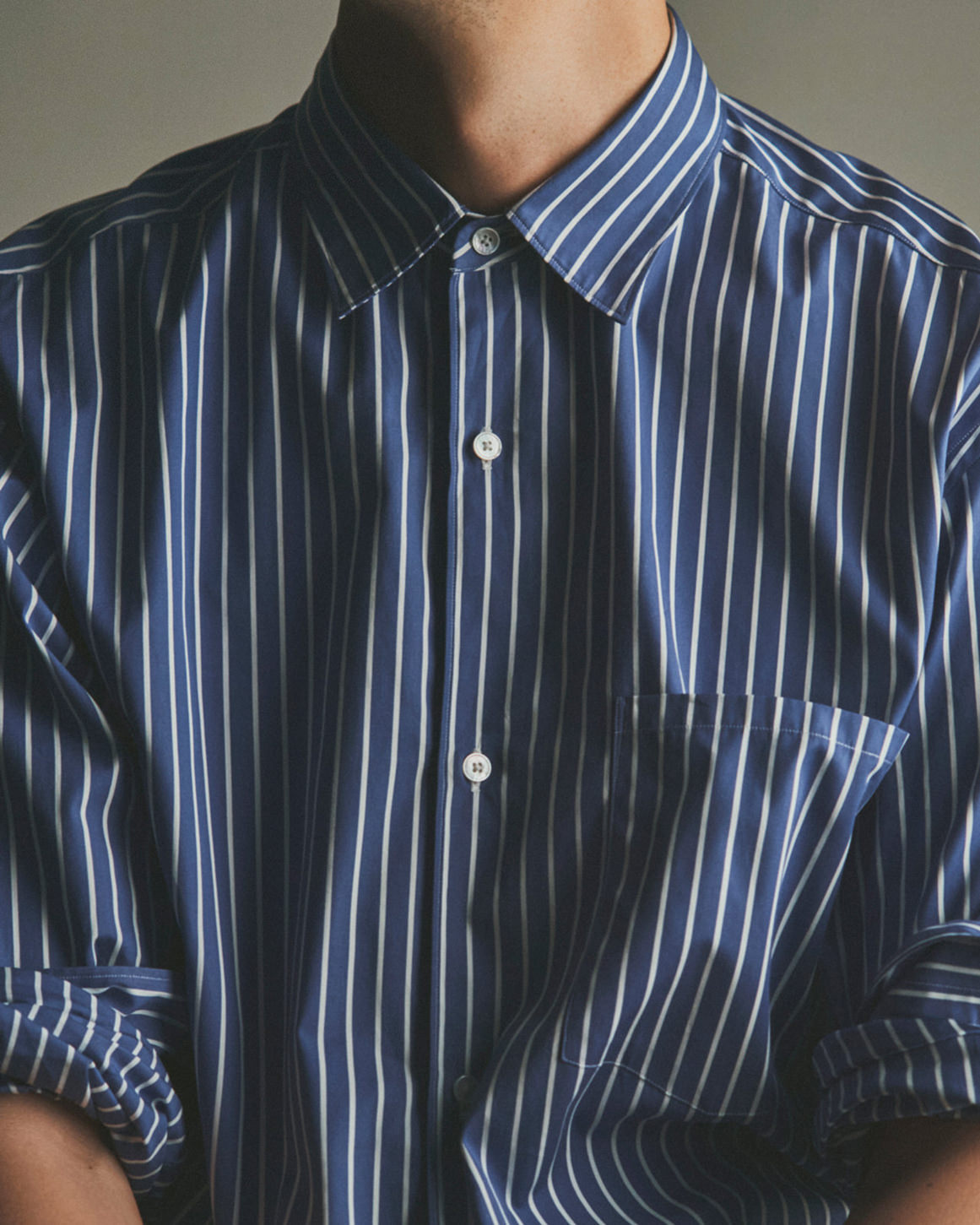 「ストライプやチェックなどの柄、サイズ感や生地感など新しいシャツを選ぶポイントはさまざまあると思いますが、やはり見逃せないのは襟ですよね。襟は印象を大きく左右する最も代表的なディテールです。カジュアルシャツで言えばレギュラーカラーを基本とした場合、開きが大きくなるほどカジュアルで開放的な印象になります。カプリシャツのようなリゾートシャツはその代表ですね。加えて、ネックポイントが高ければクラシックな印象、低ければカジュアルでリラックスした雰囲気が出ますし、襟のやわらかさはシャツ自体の雰囲気に直結することが多いと思います。第一ボタンを留めて着ないとしても、留めてみたときの印象を確かめてみると、よりそのシャツの雰囲気をつかみやすいかもしれません」